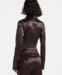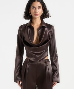 This satin cowl shirt reimagines classic shirting through a sensual, fluid lens. Designed in a rich brown hue, it features a softly draped cowl neckline that falls into a deep plunge, anchored by a delicate gold-tone chain detail across the chest. Crafted from high-shine satin, the fabric delivers an elegant sheen that elevates the silhouette. With a structured collar and long sleeves, this piece balances elegance with allure—ideal for elevated evening styling. A tonal vegan leather Eiffel plaque at the back neck adds a subtle signature finish.