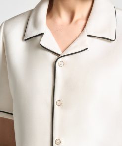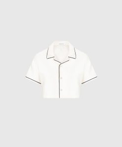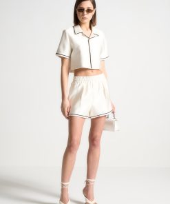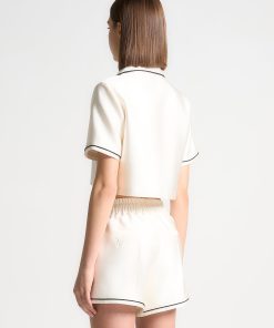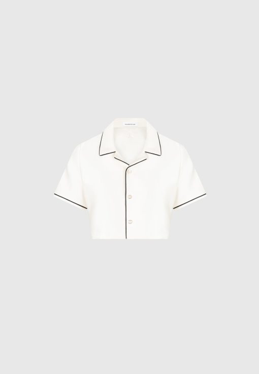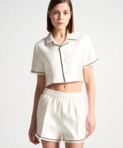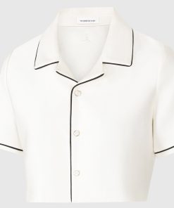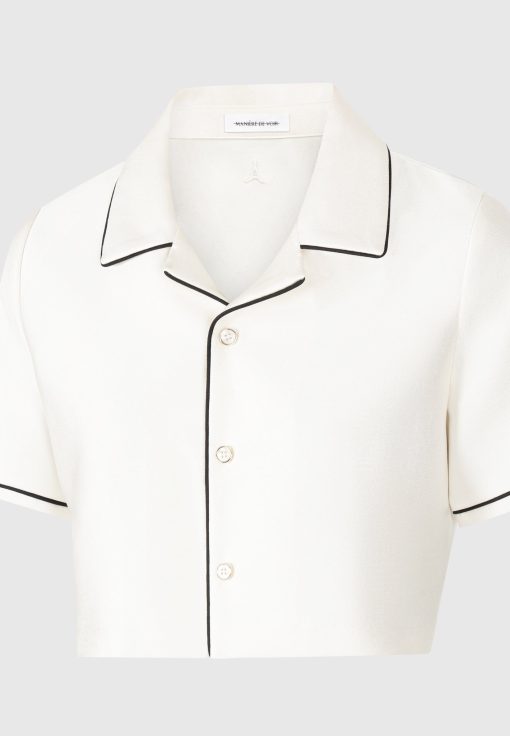 Expertly crafted with a relaxed fit and cropped design, our Satin Cropped Shirt features subtle piping details for a touch of sophistication. Made from high-quality satin material, this shirt is the perfect addition to any wardrobe for a timeless and elegant look.