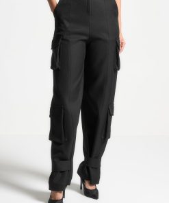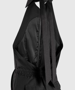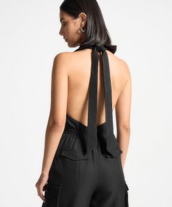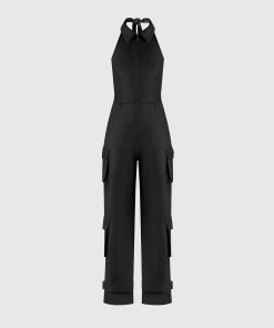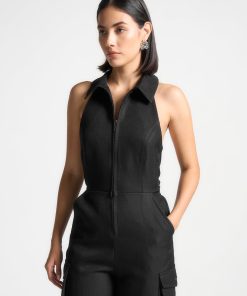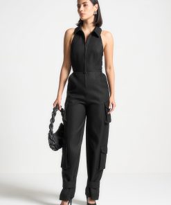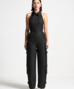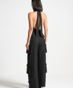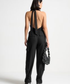 This Tailored Halterneck Cargo Jumpsuit in black is the perfect blend of form and function. With cargo pockets and leg straps, you can easily store your essentials while keeping your hands free. The tie neck adds a stylish touch and allows for a customised fit. Stay effortlessly chic in this jumpsuit.