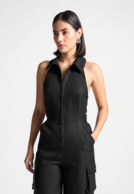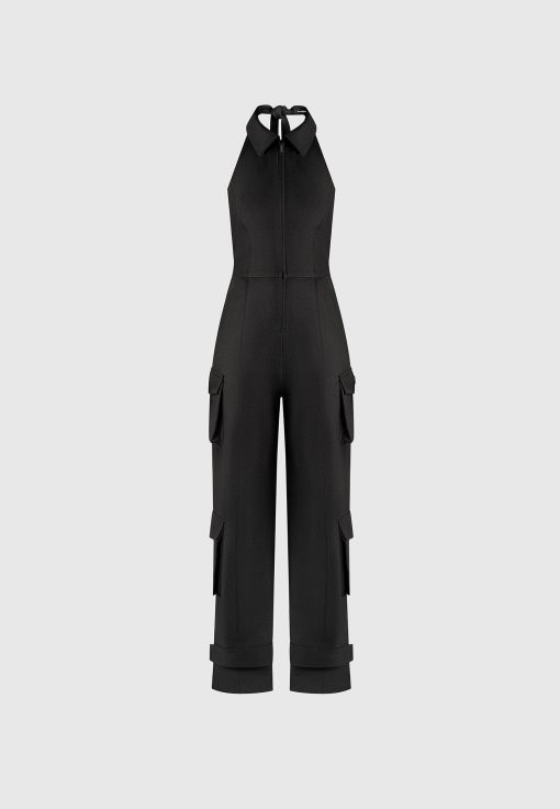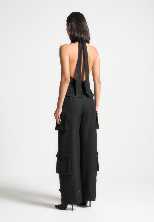 This Tailored Halterneck Cargo Jumpsuit in black is the perfect blend of form and function. With cargo pockets and leg straps, you can easily store your essentials while keeping your hands free. The tie neck adds a stylish touch and allows for a customised fit. Stay effortlessly chic in this jumpsuit.