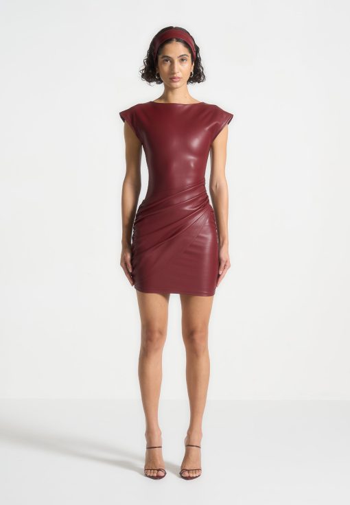 Elevate your style with our Leather Gathered Dress in Wine Red. Crafted with a wrap skirt and ruching, this dress exudes sophistication and is a timeless addition to your wardrobe. Make a statement in any setting.