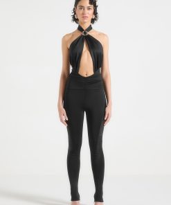 Make a bold statement with this sophisticated jumpsuit, featuring a halter neckline with a silver hammered adjuster and a refined front cutout. Designed with a ruched high waist and a tailored, figure-enhancing silhouette, this piece exudes elegance and modern glamour, perfect for upscale events and refined styling.
