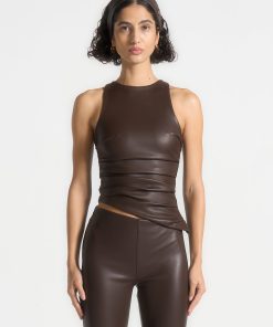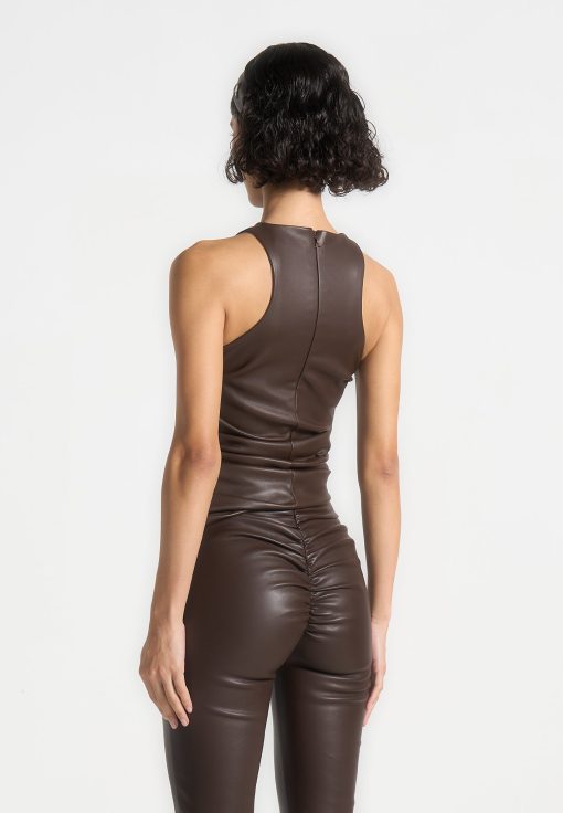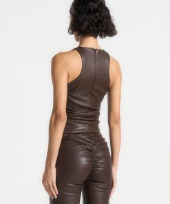 This top features a racer neck and a flattering fit, accentuated by gathered detailing. Crafted with premium vegan leather, this top offers a sleek and sophisticated look that effortlessly elevates any outfit.