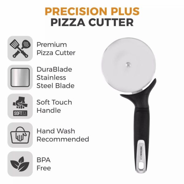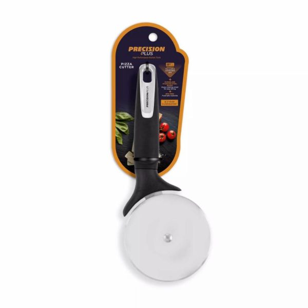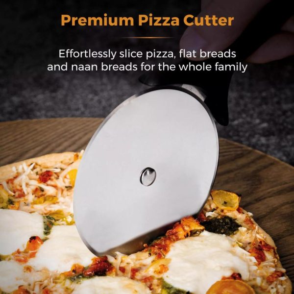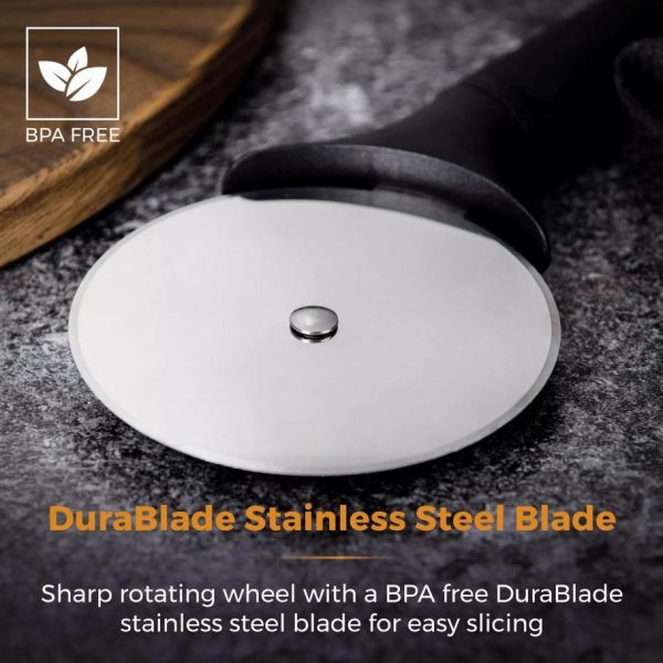 Sharp rotating wheel makes cutting into pizza smooth and easy